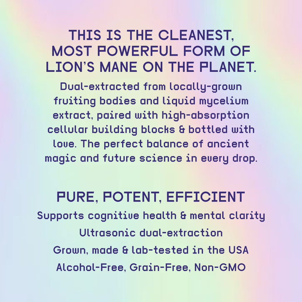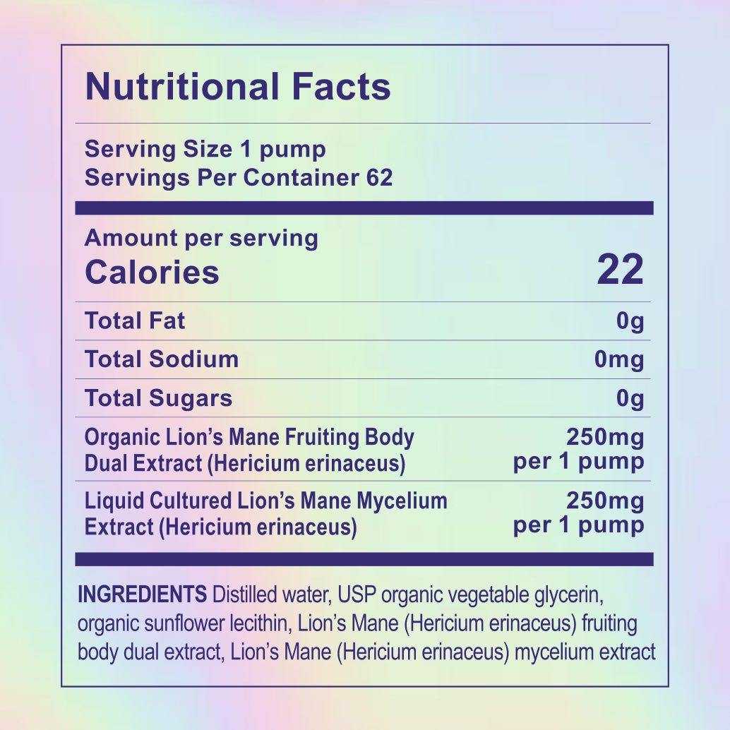 Each 8mL pump supplies 250mg of Lion's Mane fruiting body and 250mg of mycelium extract. Lion's Mane contains bioactive compounds that research suggests support focus, creativity, and cognitive function.